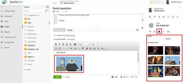 Včasih je lahko nekaj tako preprostega, kot je GIF klepetu odličen način, da se zahvalite, in poveste, da stranko cenite. V LiveAgent lahko uporabite GIF, ko aktivirate vtičnik. To je lep način, da strankam polepšate dan. Vendar ga uporabljajte previdno in spoštljivo.