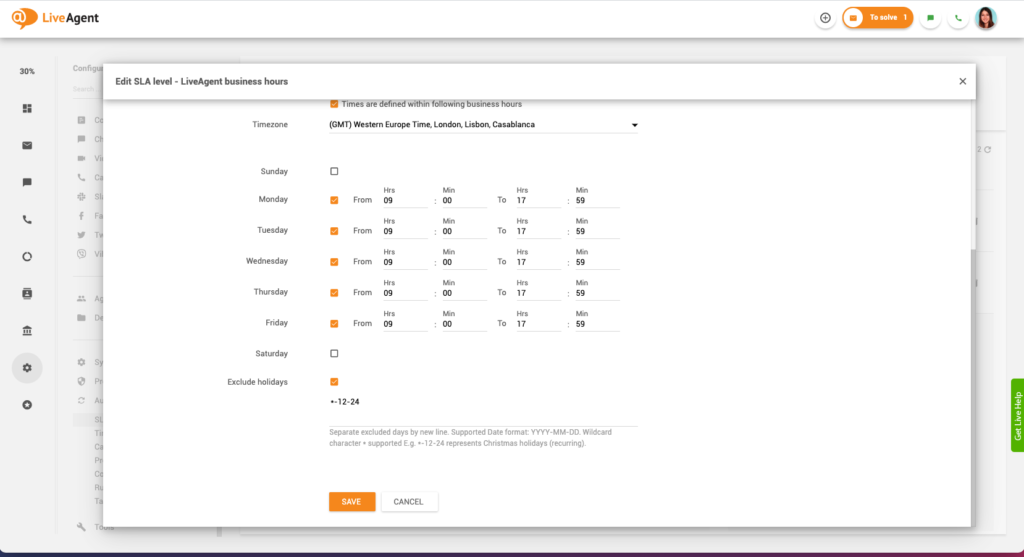 Odkrijte, kako določiti optimalne poslovne ure za vaše podjetje in omogočite 24/7 podporo s pomočjo programske opreme LiveAgent. Izboljšajte zadovoljstvo strank in učinkovitost poslovanja z avtomatizacijo in prilagodljivimi nastavitvami delovnega časa. Preizkusite LiveAgent brezplačno in dvignite svojo storitev na višjo raven!