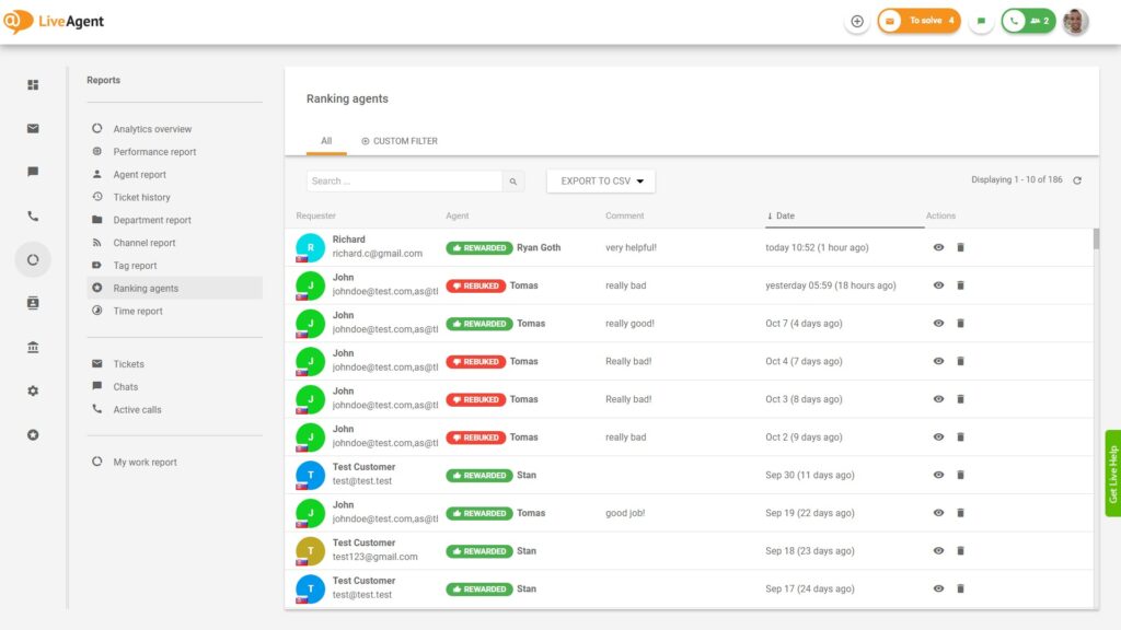 The agent ranking overview is a complete report of all positive and negative agent reviews. The report is complete with comments from customers, the date the review was received, and even gives you the option to navigate to the ticket that the agent was solving when they received the review.
