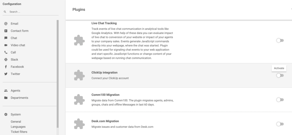- Če želite integrirati ClickUp, odprite LiveAgent in pojdite na Konfiguracija> Sistem> Vtičniki. Na seznamu poiščite vtičnik ClickUp, kliknite stikalo za aktiviranje in LiveAgent se bo znova zagnal.