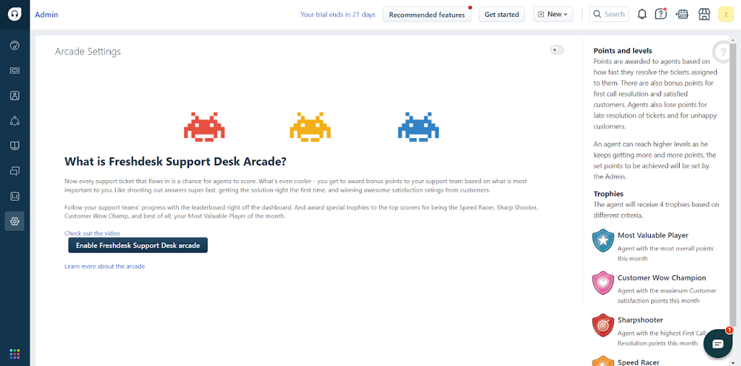 Takoj ko je to opravljeno, je naslednji korak omogočiti Freshdesk Support Desk Arcade v nastavitvah in prava zabava se lahko začne.
