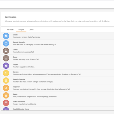 Ko nastavite vse tri funkcije igrifikacije v skladu z vašimi željami, bo sistem v LiveAgentu začel slediti zahtevanim podatkom v skladu z merili. Ko agent izpolni določene pogoje, se bo dvignil ali prejel značke. Ta postopek je popolnoma avtomatiziran, tako da vam poleg nastavitve ni treba narediti ničesar drugega.