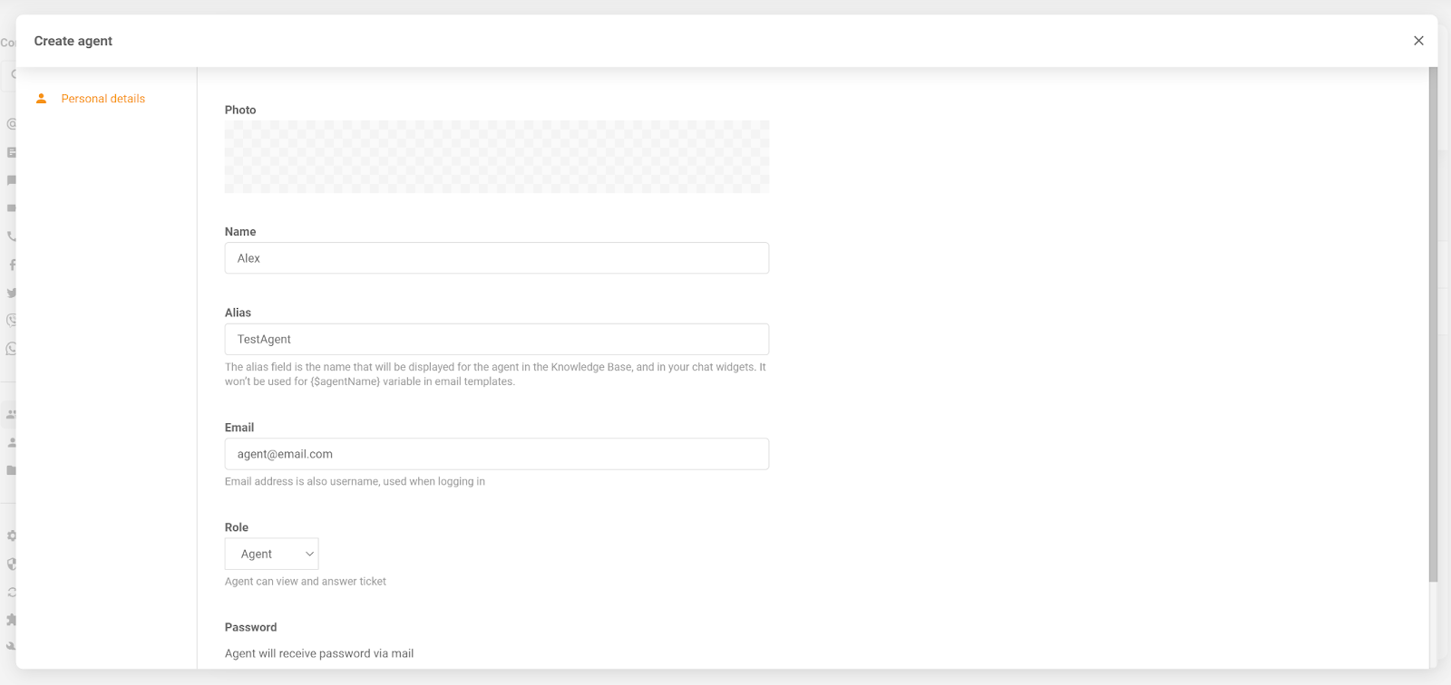 Prva stvar, ki jo morate narediti, preden začnete nastavljati funkcije gamifikacije, je, da dodate nove agente v račun LiveAgent. To lahko preprosto storite z uporabo vodnika za začetek, ki vključuje možnost dodajanja novih uporabnikov. Lahko pa greste v Nastavitve in poiščete razdelek Agenti. Ta postopek vključuje dodajanje agentovega imena, slike profila, vzdevka, e-pošte in vloge agenta. Ko končate, bo LiveAgent poslal e-pošto s podatki za prijavo na e-poštni naslov novega agenta.