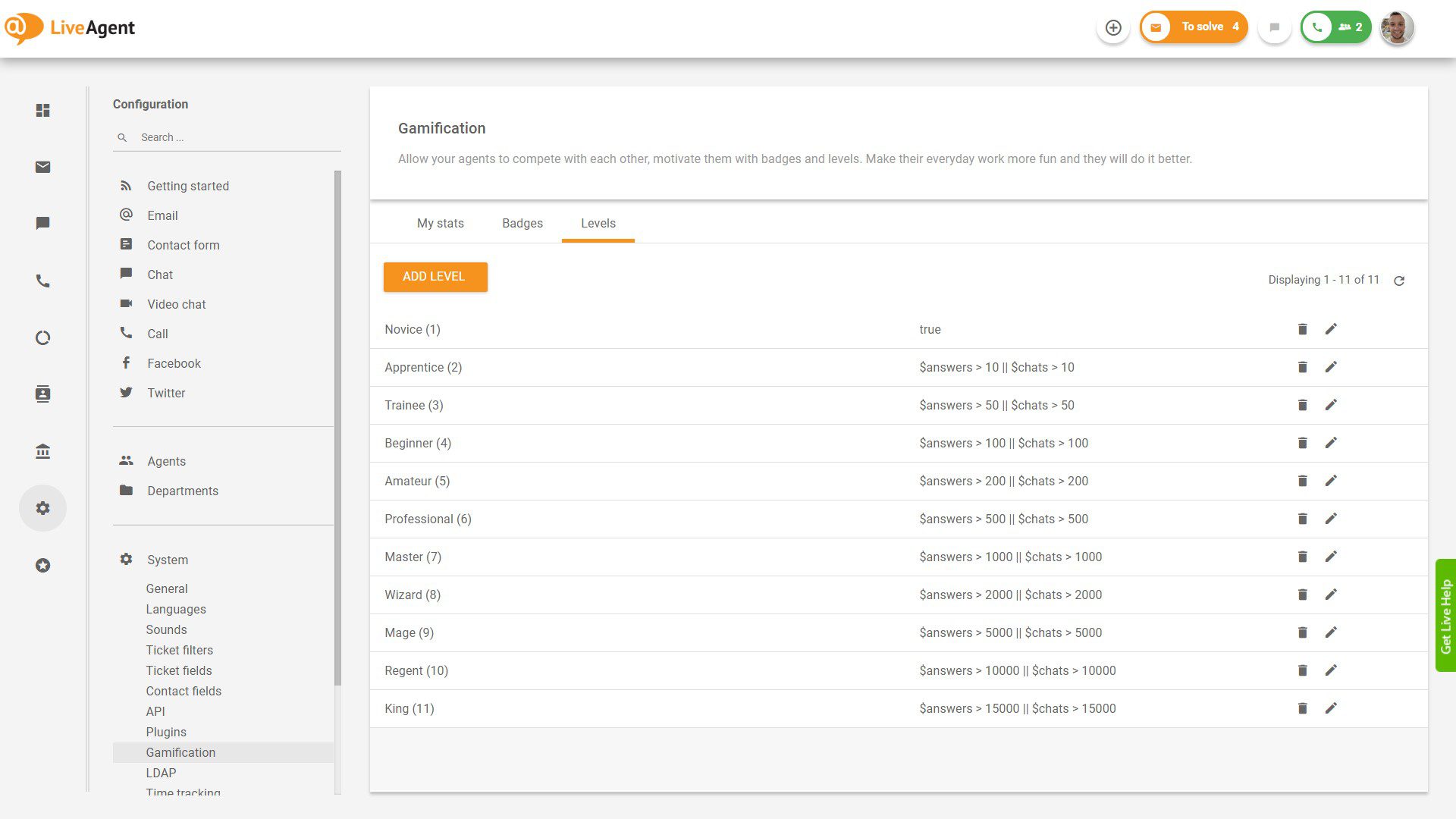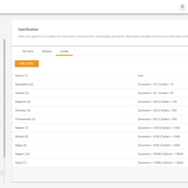 Ravni v LiveAgent delujejo natanko tako kot izravnave v igrah igranja vlog. Vsak agent se bo na podlagi svojih izkušenj dvignil na višjo raven. Najboljši del je, da lahko vsak skrbnik računa LiveAgent na kakršen koli način prilagodi ravni. Lahko jih preimenujete, izberete različne opise in nastavite pogoje po meri za doseganje določene stopnje. Uporabniki so lahko toliko ustvarjalni, kolikor želijo, da naredijo višje ravni veliko bolj zanimive za vsakega agenta. Navdihnete lahko na primer svojo najljubšo igro RPG.