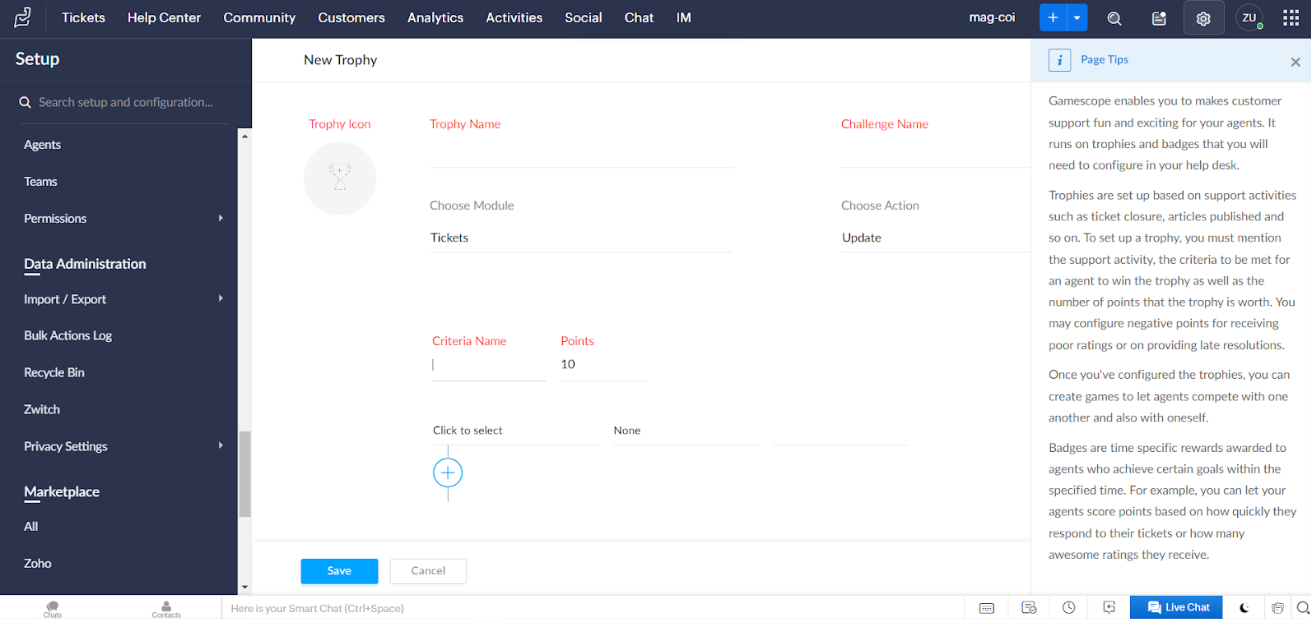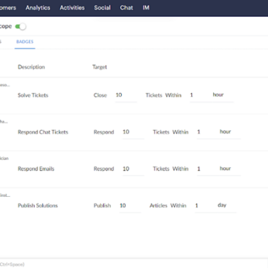 Ena od ključnih značilnosti igrifikacije Zoho Deska je sistem značk. Agenti za podporo si lahko prislužijo značke na podlagi svoje uspešnosti, kot so “Mail Magician”, “Customer Delight” in “Ticket Terminator”. Te značke so prikazane na agentovem profilu in predstavljajo priznanje za njihove dosežke. Zoho vam omogoča tudi dodajanje značk po meri.
