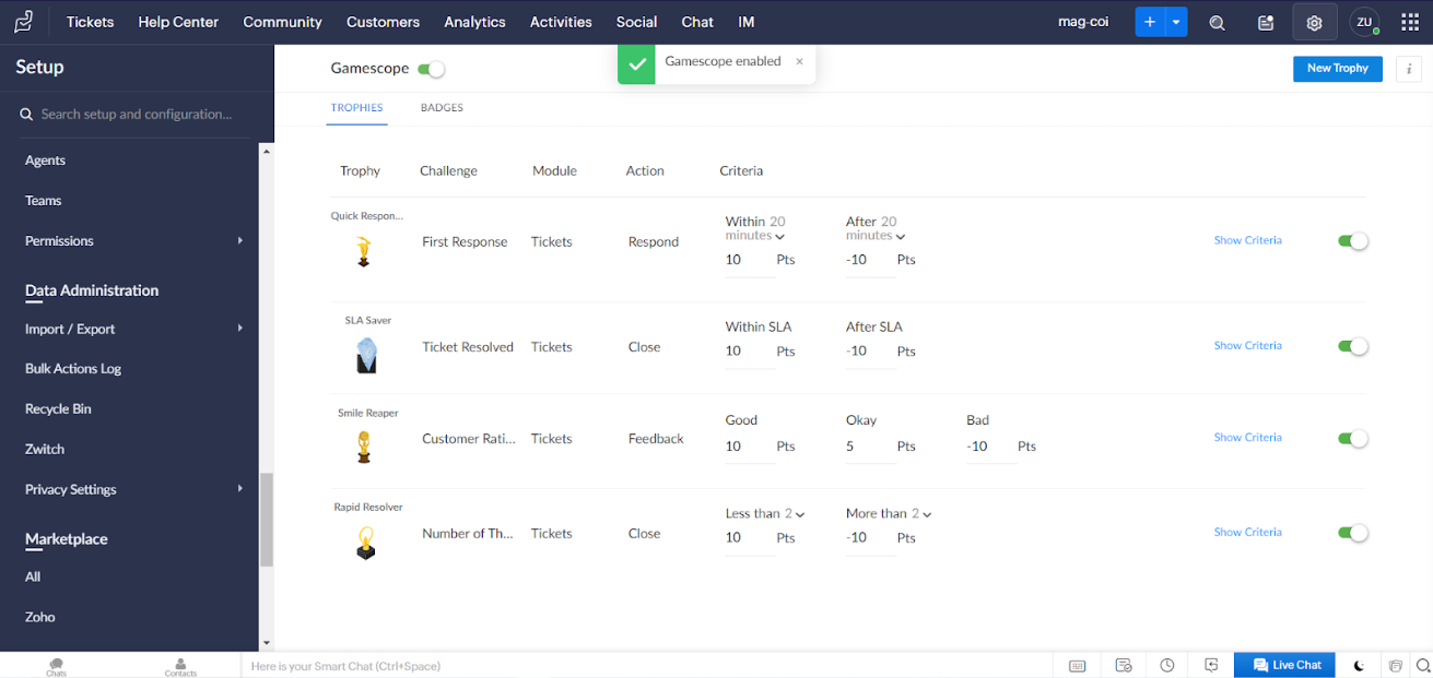Ko sem končal z nastavitvijo vseh pravil igrifikacije, je Zoho Desk samodejno začel slediti zahtevanim podatkom na podlagi kriterijev, ki sem jih shranil.