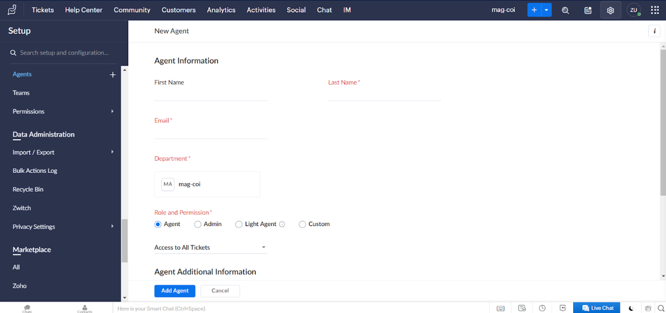 Navdušen nad preizkušanjem programske opreme, sem nadaljeval in dodal vse testne agente, da sem pravilno preučil funkcije igrifikacije z obeh strani. Za dodajanje agentov so me prosili, da zagotovim kup informacij. To je vključevalo njihova imena in priimke, e-poštne naslove in oddelek, v katerem so bili. Dodelil sem jim tudi prave vloge in dovoljenja. Obstaja še nekaj nastavitev, ki jih lahko konfigurirate za svoje agente, če želite biti temeljiti, vendar sem se odločil, da jih preskočim samo zato, ker niso bile tako pomembne za funkcijo igrifikacije.