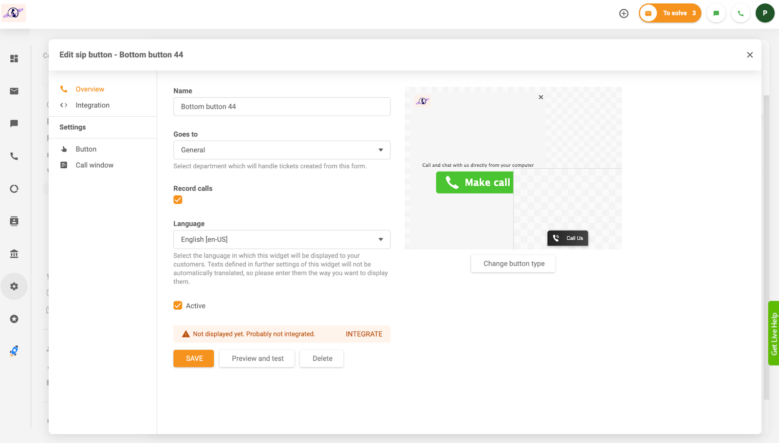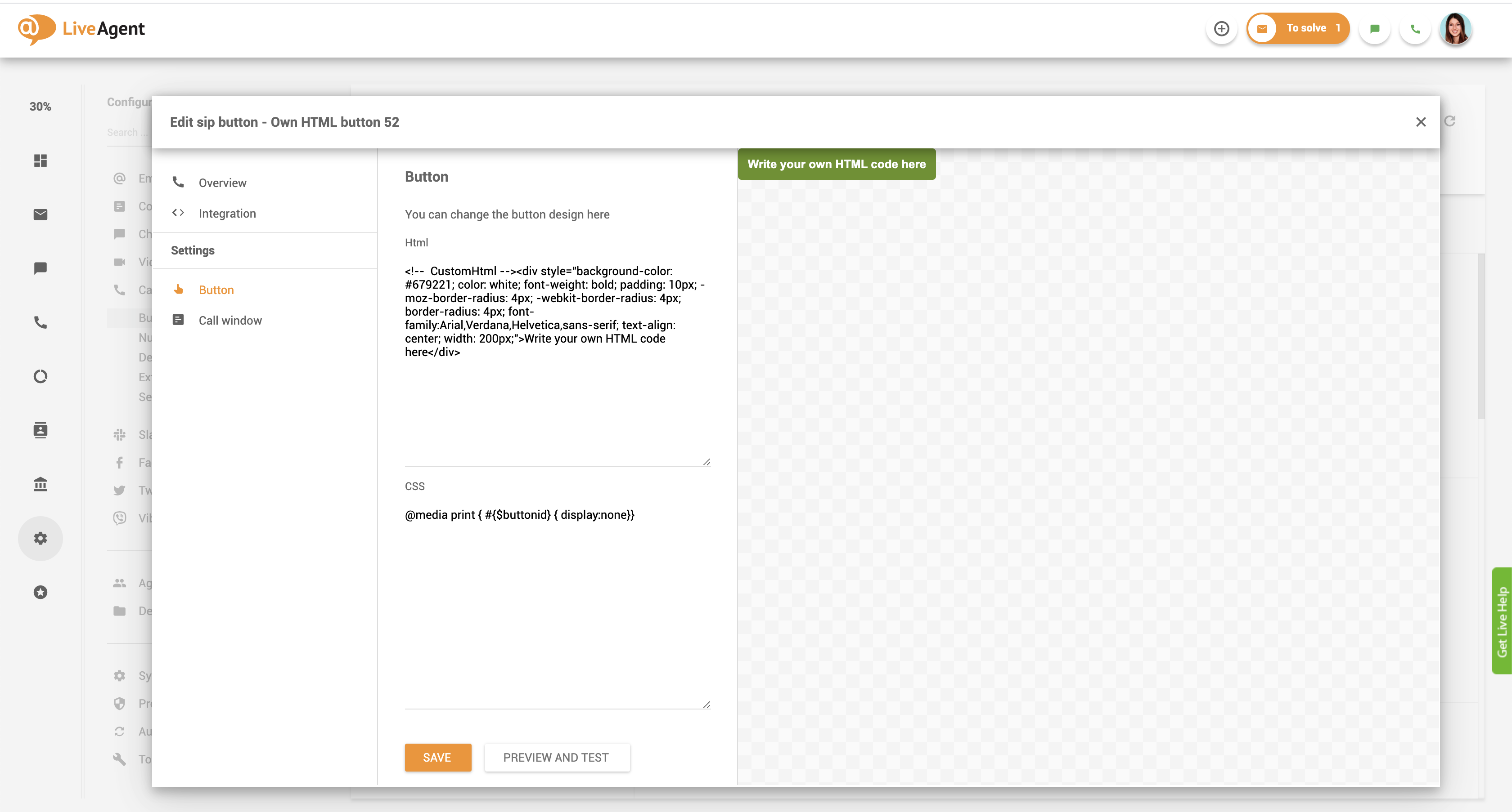 Pomaknite se do Konfiguracija>Klicni>Gumbi in izberite želeni gumb ali ustvarite gumba po meri. Pojdite na zavihek Integracija in kopirajte kodo html. To lahko preprosto prilepite na svoje spletno mesto ali v razdelek Pred kodami za sledenje v vaši bazi znanja LiveAgent.
