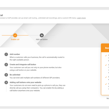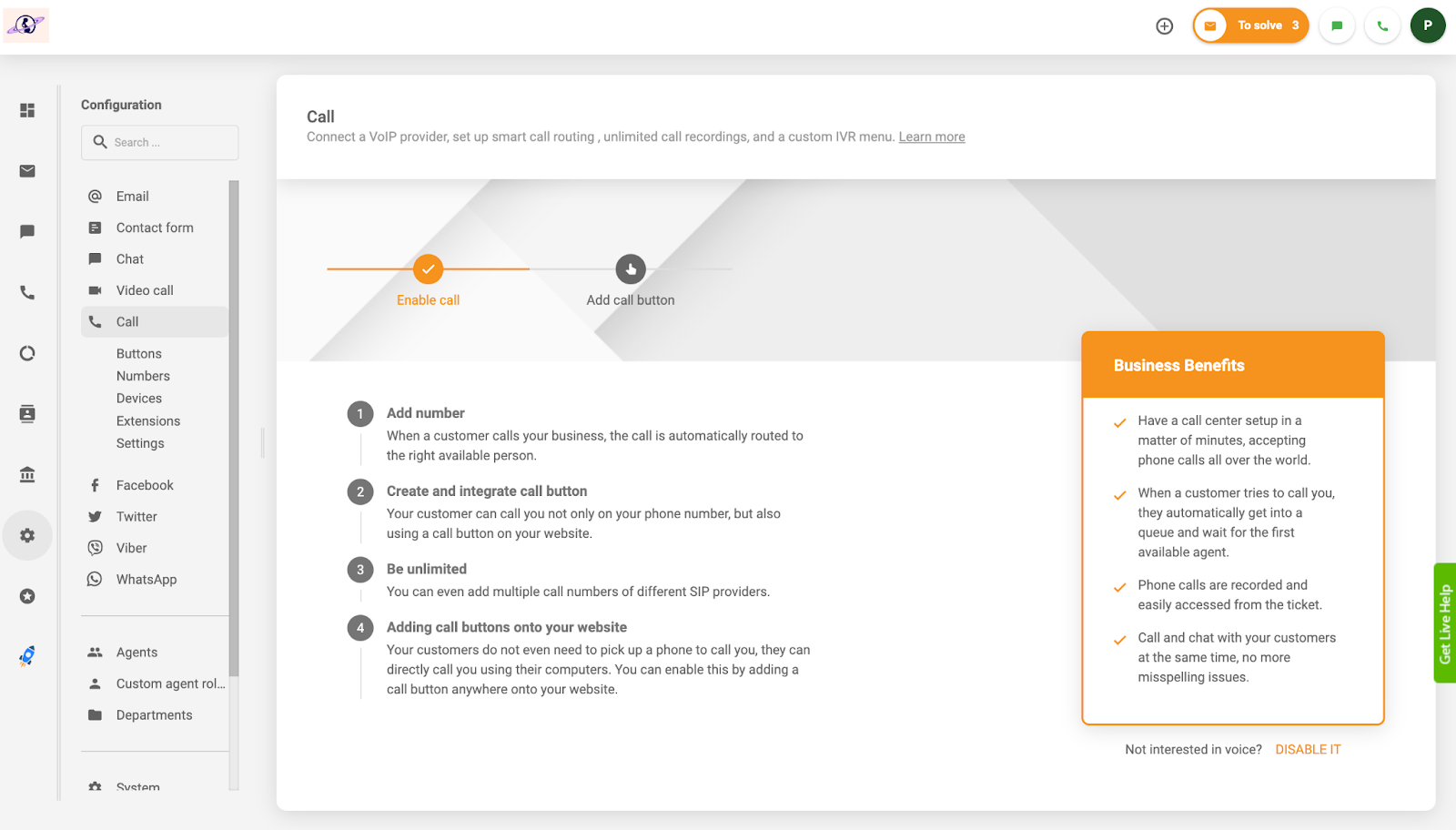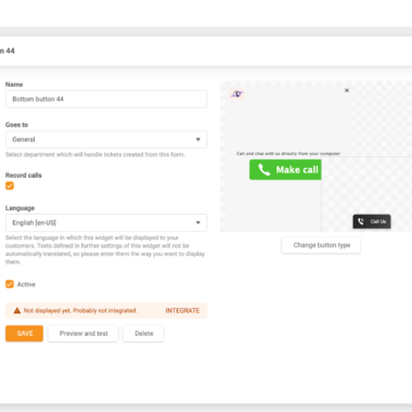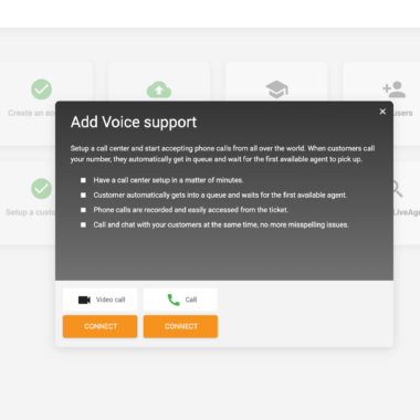 Ko sem končal in se vrnil na armaturno ploščo, sem dodal logotip podjetja za posipe in glasovno podporo, saj bo ta pregled krožil okoli funkcij klicnega centra. Pri nastavitvi glasovne podpore imate možnost vzpostaviti video ali zvočni klic. Izbral sem klasično ikono telefona, da vidim, kako lahko dodam svojo številko.