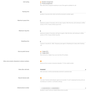 Pojdite na Konfiguracija>Klic>Nastavitve in kjer lahko izbirate med naključno in prednostno dodelitvijo. Obstaja tudi možnost spreminjanja časa usmerjanja, kjer bi bil preusmerjen k drugemu razpoložljivemu agentu.