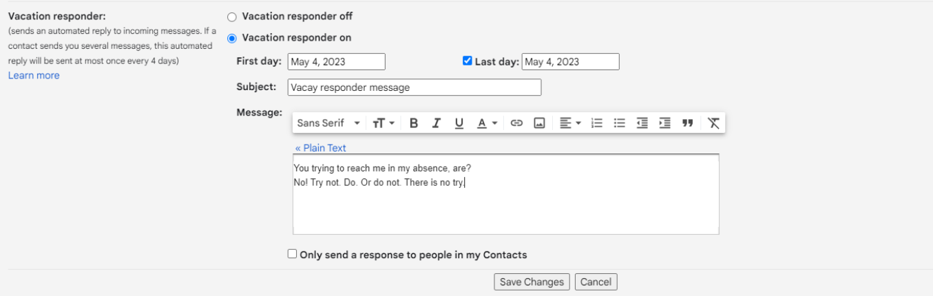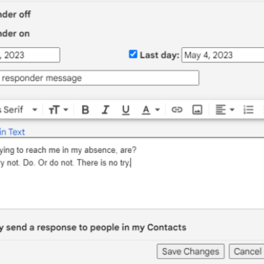 Najprej sem opazil odzivnik na počitnicah. Seveda je ključnega pomena pošiljanje samodejnih sporočil v vaši odsotnosti, ki ljudi obveščajo o vaši nedosegljivosti, zato sem ga konfiguriral.