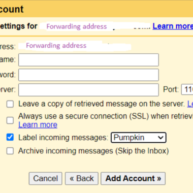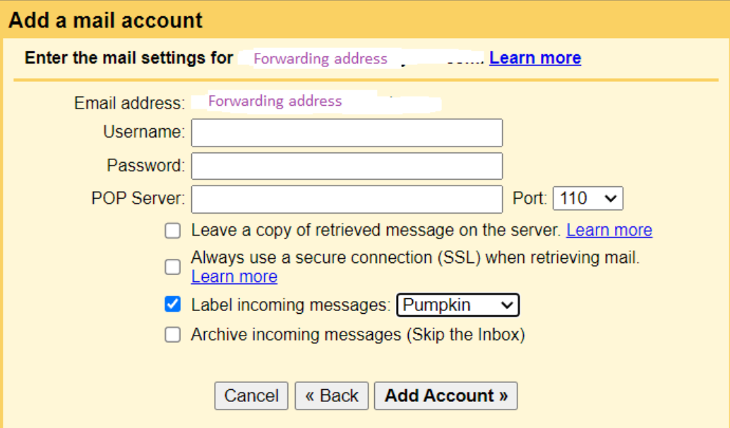 Če želite dodati e-poštni naslov za posredovanje, kliknite gumb Dodaj naslov za posredovanje. To sproži pojavno okno, kjer morate izpolniti naslov za posredovanje, geslo, strežnik POP in vrata ter po želji dodati druge konfiguracije. Ko končate, kliknite Dodaj račun.