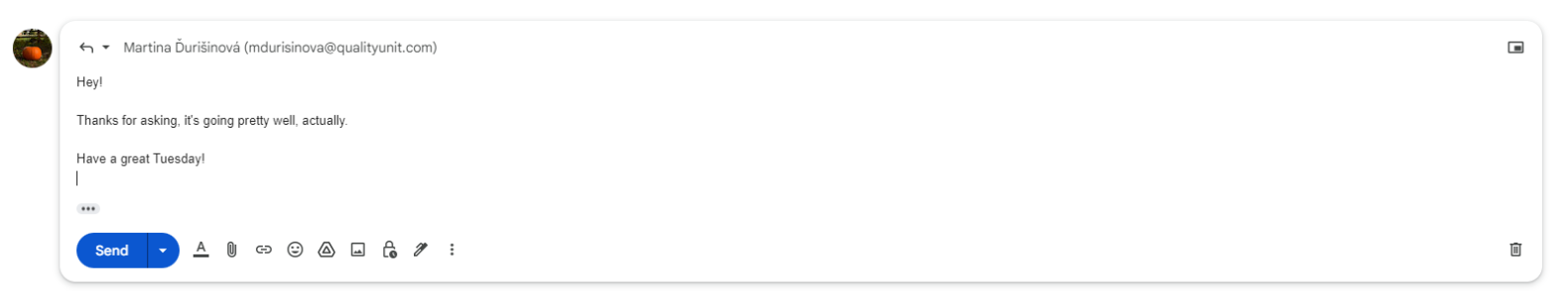 Odgovarjanje na e-pošto je zelo preprosto. Vse kar morate storiti je, da vnesete svoje sporočilo in pritisnete gumb Pošlji. Če želite priložiti datoteke iz svojega računalnika ali Google Drive, podpisati svojo e-pošto ali preklopiti na prej omenjeni način Zaupno, lahko to storite kar v urejevalniku sporočil.