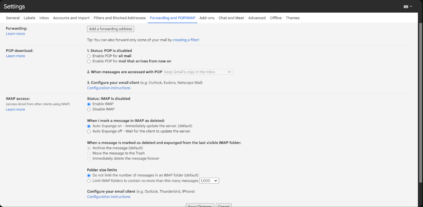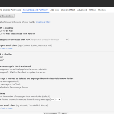Če ga želite nastaviti, pojdite v Nastavitve in izberite zavihek Posredovanje in POP/IMAP. Tam lahko dodate enega ali več naslovov za posredovanje in omogočite dostop do svojega računa Gmail drugim odjemalcem, ki uporabljajo IMAP.
