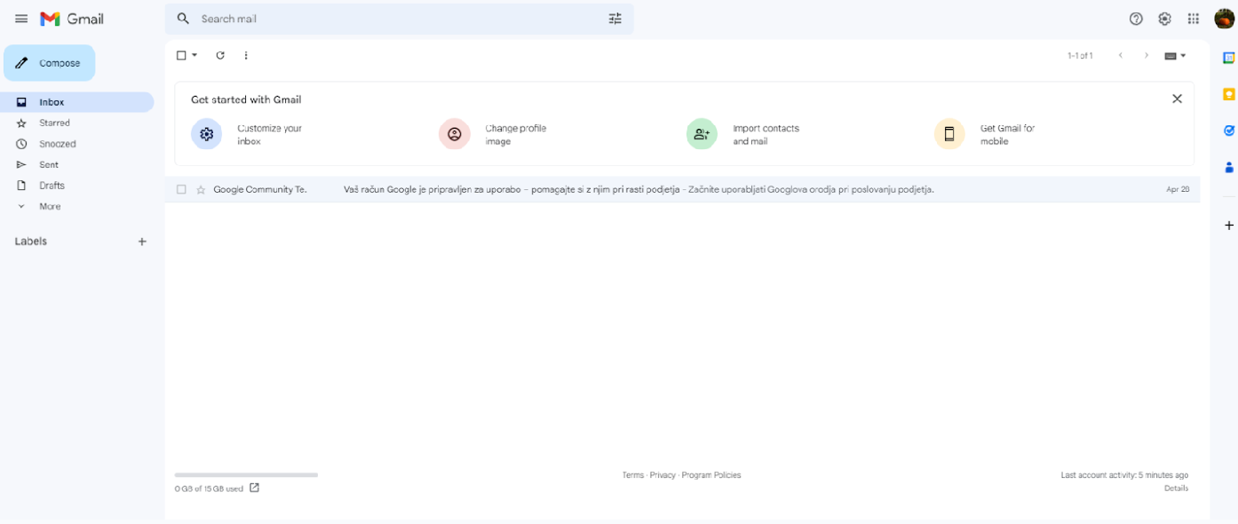 Pričakala me je standardna postavitev mape »Prejeto«. Googlova skupnost me je sprejela s sporočilom z nekaj nasveti in dodatnimi koraki, ki jih lahko izvedem za prilagoditev svojega novo ustvarjenega računa.