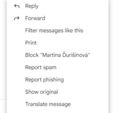 Takoj lahko odgovorite s klikom na puščico v zgornjem desnem kotu ali pa kliknete tri pike zraven in izvedete druga dejanja, kot je prijava pošiljatelja, prenos sporočila in druga.