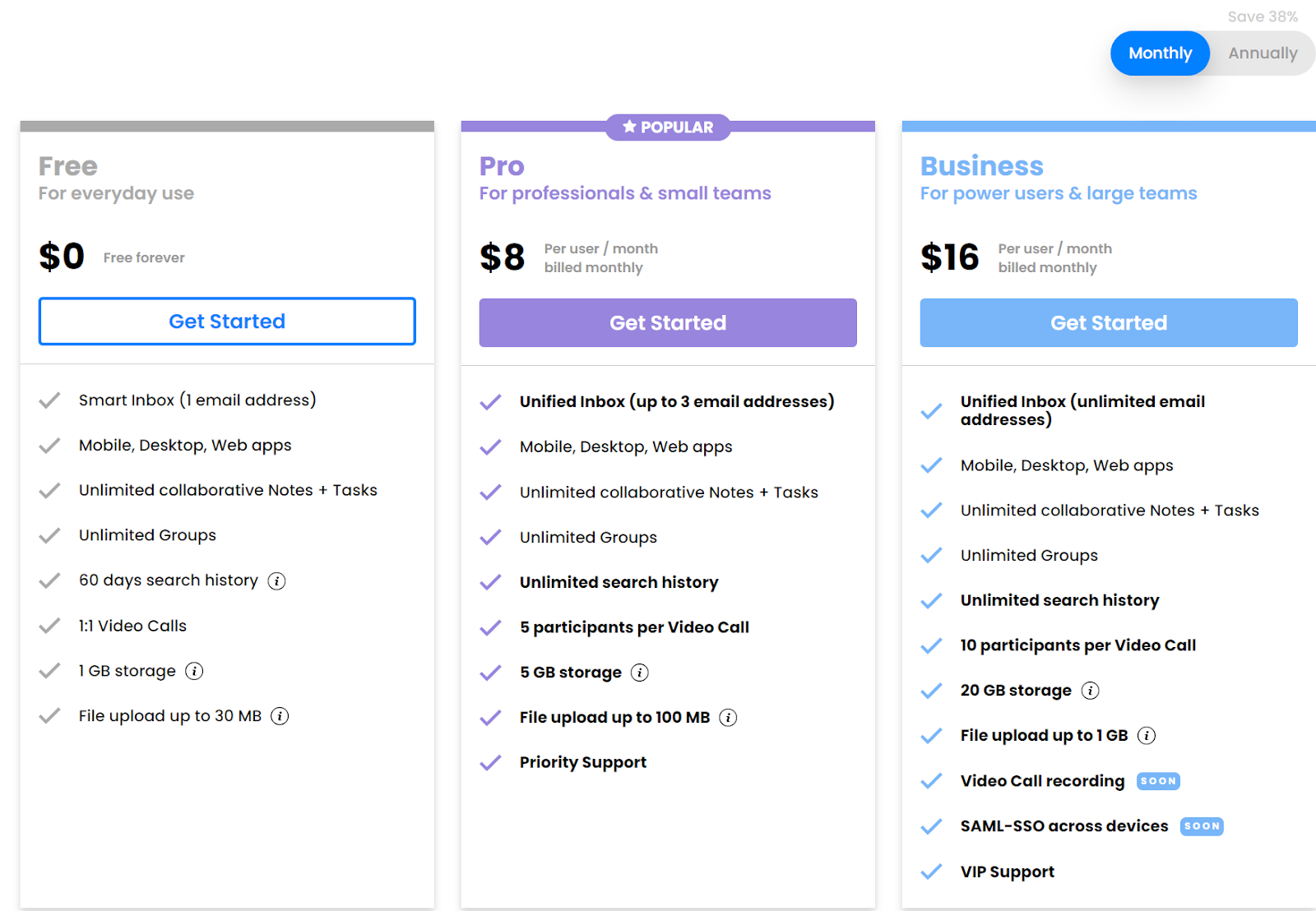 Ta naročnina stane 8 USD na uporabnika na mesec ali če se odločite za letno zaračunavanje, vas bo stala 5 USD na uporabnika na mesec. Naročnina Pro ponuja vse funkcije, vključene v brezplačni paket, in nekaj dodatnih funkcij, kot so neomejena zgodovina iskanja, video klici s 5 udeleženci, 5 GB prostora za shranjevanje, nalaganje datotek do 100 MG in prednostna podpora strankam.