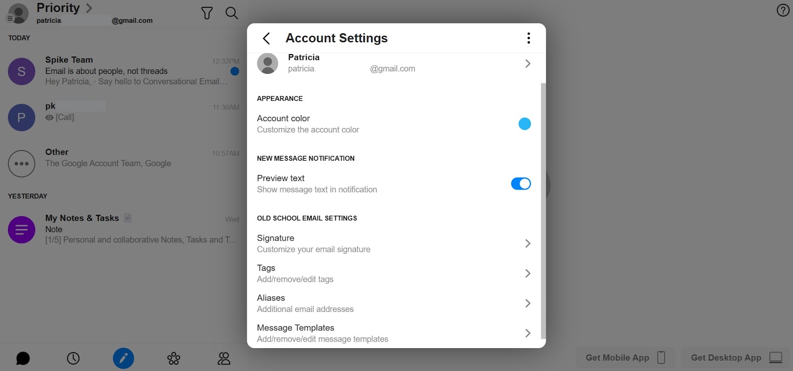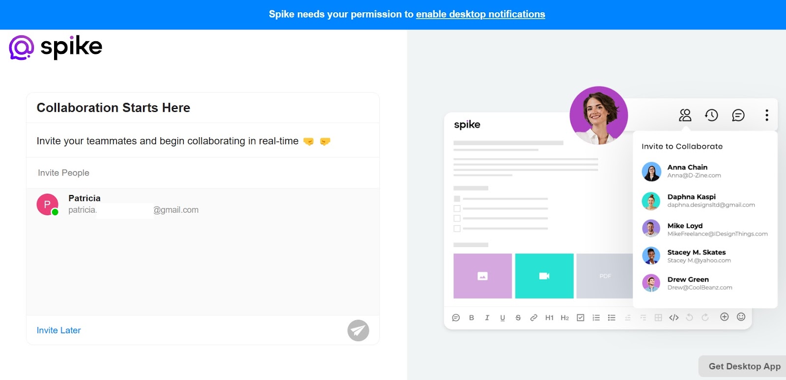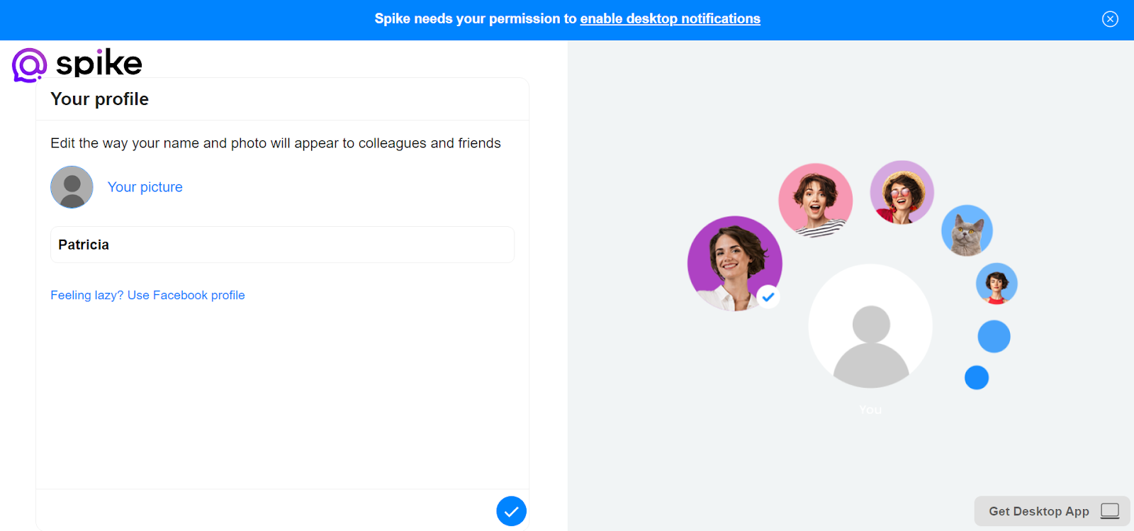 Nastavitev Spike je precej preprosta in traja le nekaj minut. Lahko se prijavite z Googlom ali pa uporabite kateri koli drug e-poštni račun, ki ga uporabljate. Ko ustvarite svoj račun pri Spikeu, lahko naložite svojo sliko in uredite ime, ki bo prikazano vašim sodelavcem.