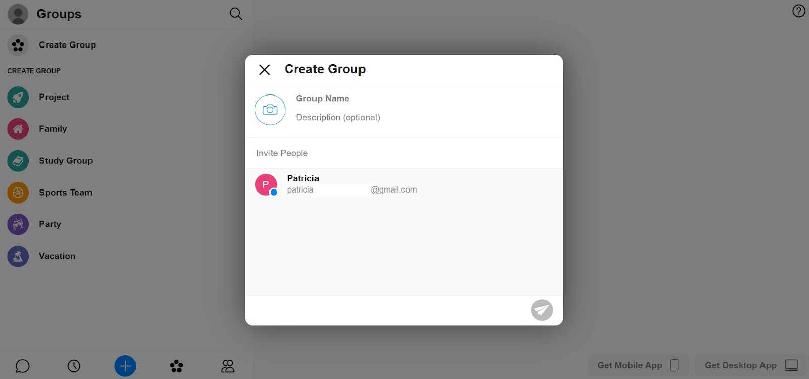 Četrta ikona se imenuje »Skupine«, ki vam omogoča, da ustvarite različne skupine ljudi, da bo vse bolj organizirano. Ustvarite lahko skupine na podlagi projektov, na katerih delate, družinskih članov, študijskih skupin, skupin prijateljev in mnogih drugih. Samo poimenujte skupino, napišite kratek opis in povabite ljudi v skupino.