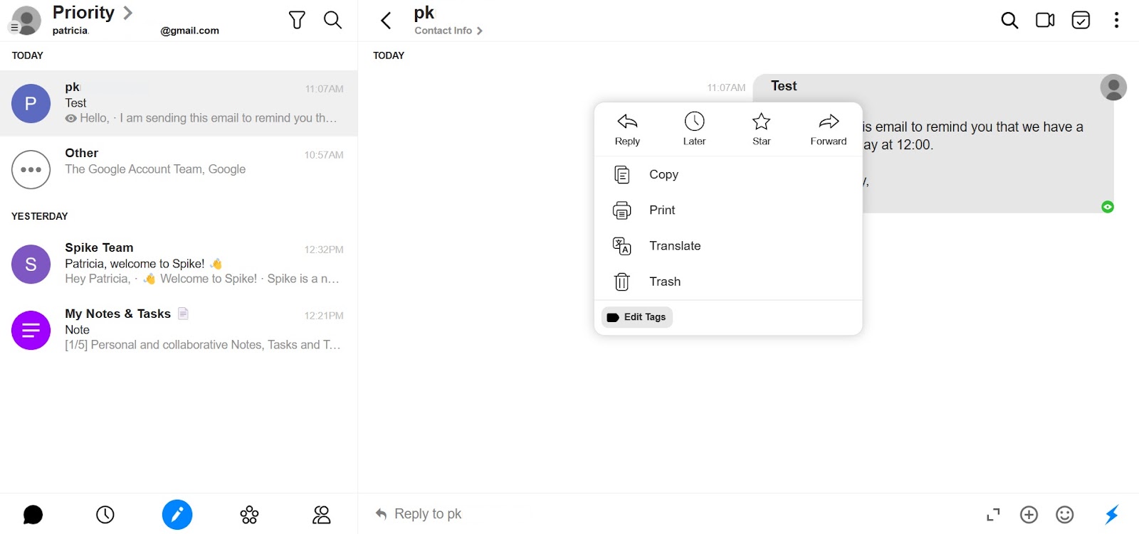 Kot smo že omenili, je Spike orodje, ki je zelo intuitivno tudi za novega uporabnika, saj je zelo dobro organizirano, njegov vmesnik, podoben klepetu, pa je zelo edinstven v primerjavi s številnimi drugimi sistemi za upravljanje e-pošte. Tako so pogovori in sporočila videti bolj neformalni in inovativni.