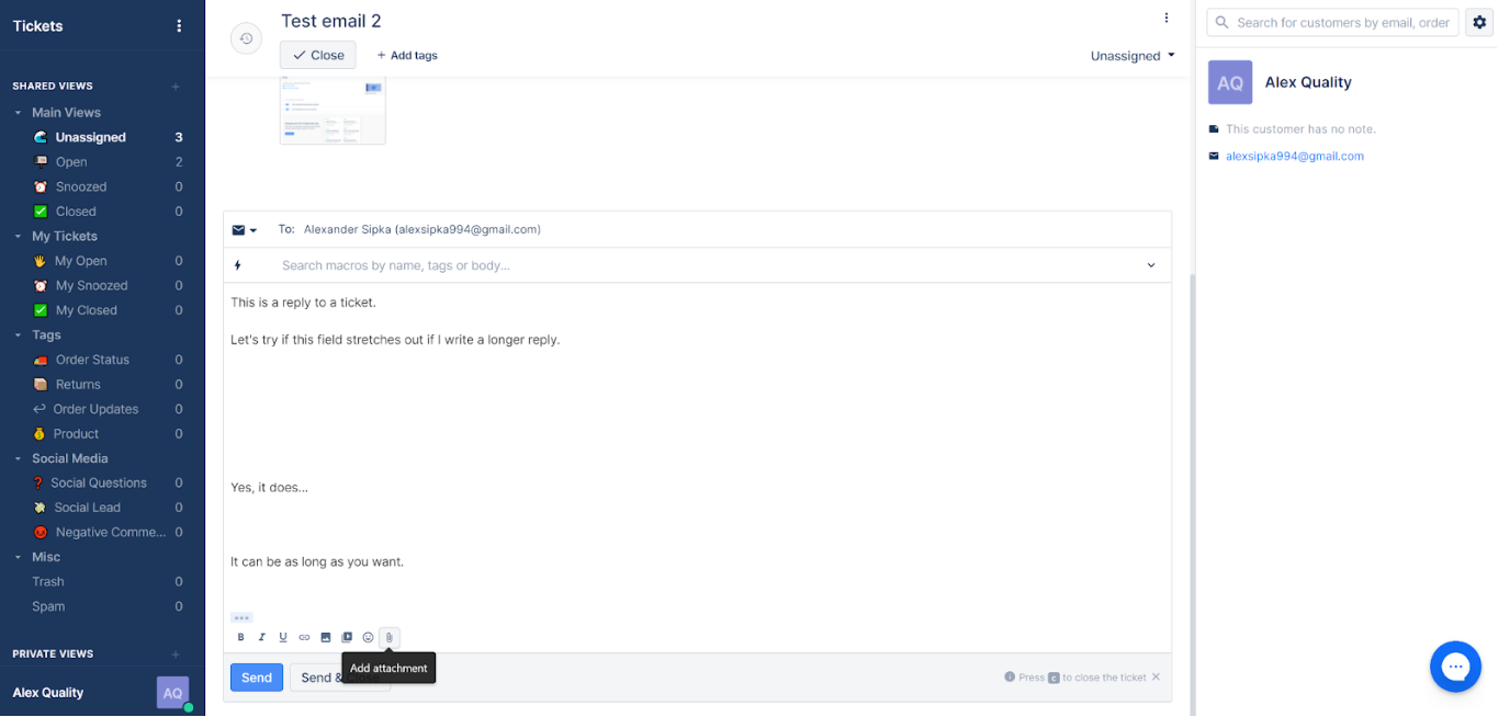 Na splošno je Gorgiasov vmesnik za zahtevek zelo dober in vse deluje, kot je predvideno. Svoje besedilo lahko prilagodite z zadostnimi možnostmi urejanja besedila in dodate različne vrste prilog. Zahtevki podpirajo slike in videoposnetke, dodate pa lahko povezave in emojije. Pripravljene odgovore lahko najdete v razdelku Makri v nastavitvah Gorgias in nastavite tudi samodejne odgovore izven delovnega časa za obravnavo komunikacije, dokler se ne vrnete.