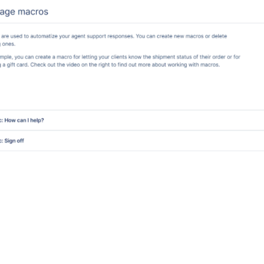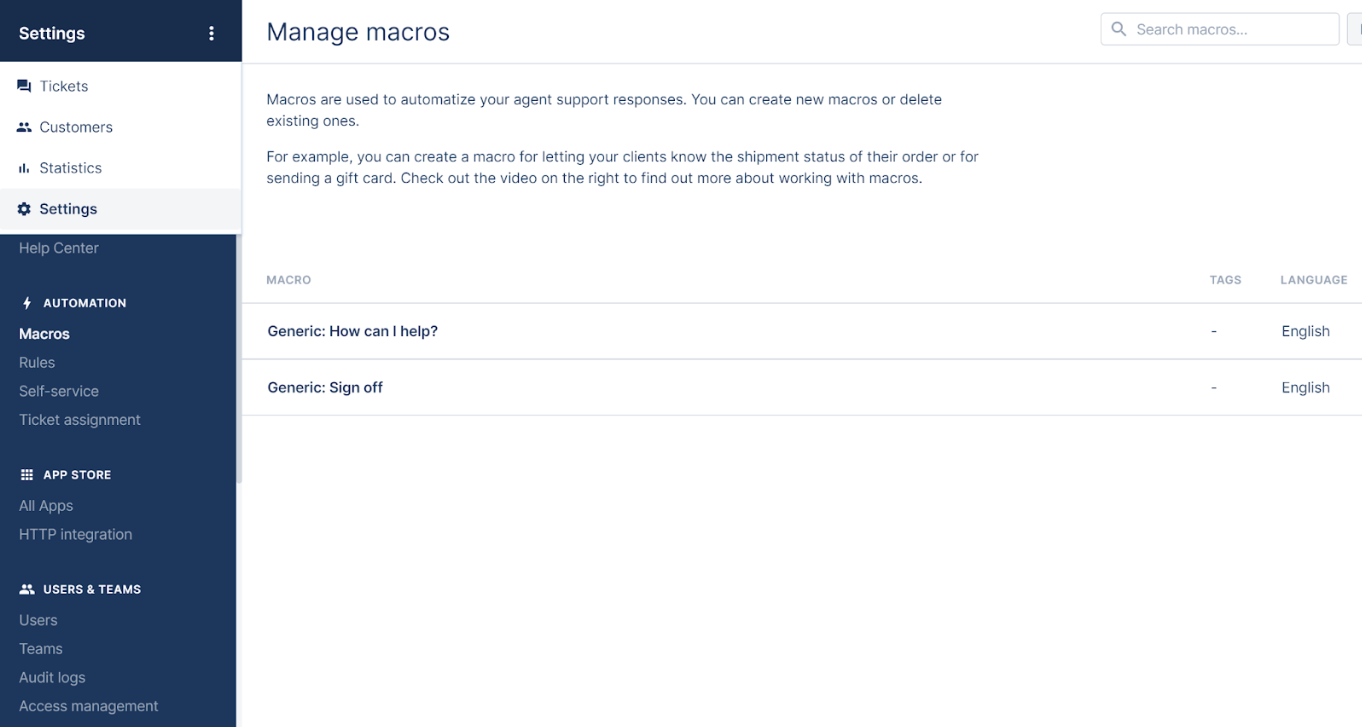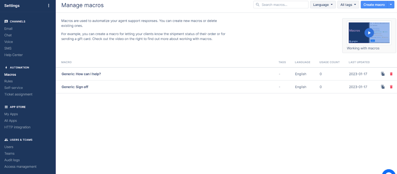 Pojdite v nastavitve Gorgias in v razdelku Avtomatizacija izberite Makri. Tukaj lahko ustvarite makre, ki pošiljajo samodejna e-poštna sporočila, če so izpolnjena določena merila. Napišete lahko svoje besedilo in izbirate med številnimi dejanji, ki služijo kot sprožilci za samodejni odgovor. Gorgias vam omogoča tudi nalaganje obstoječih makrov v formatu CSV, če jih imate na voljo.