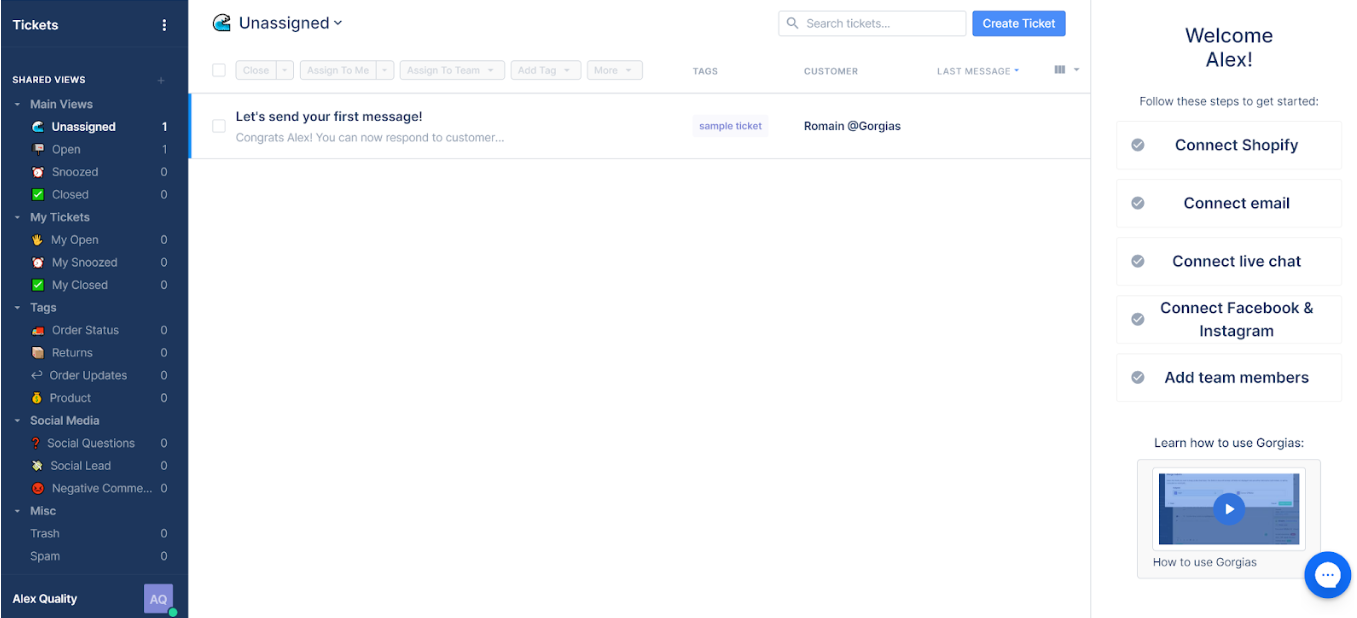 Uvodni zaslon je vmesnik sistema za zahtevke, tako da lahko že ugibate, da Gorgias ne izgublja časa in pripelje uporabnike točno tja, kamor želijo. Sam vmesnik je v redu in precej dobro oblikovan. Sistem izdajanja zahtevkov je na prvi pogled videti precej dober in je vsekakor osredotočen na tisto, kar je pomembno, brez preveč nereda. Glavni meni imate na levi strani in njegov glavni namen je, da vam pomaga filtrirati zahtevki glede na različne kriterije. Leva plošča vas vabi, da začnete uporabljati več orodij, kot so klepet in družabna omrežja ter Shopify. Nastavitve najdete s klikom na ikono s tremi pikami v zgornjem levem kotu poleg naslova Vstopnice.