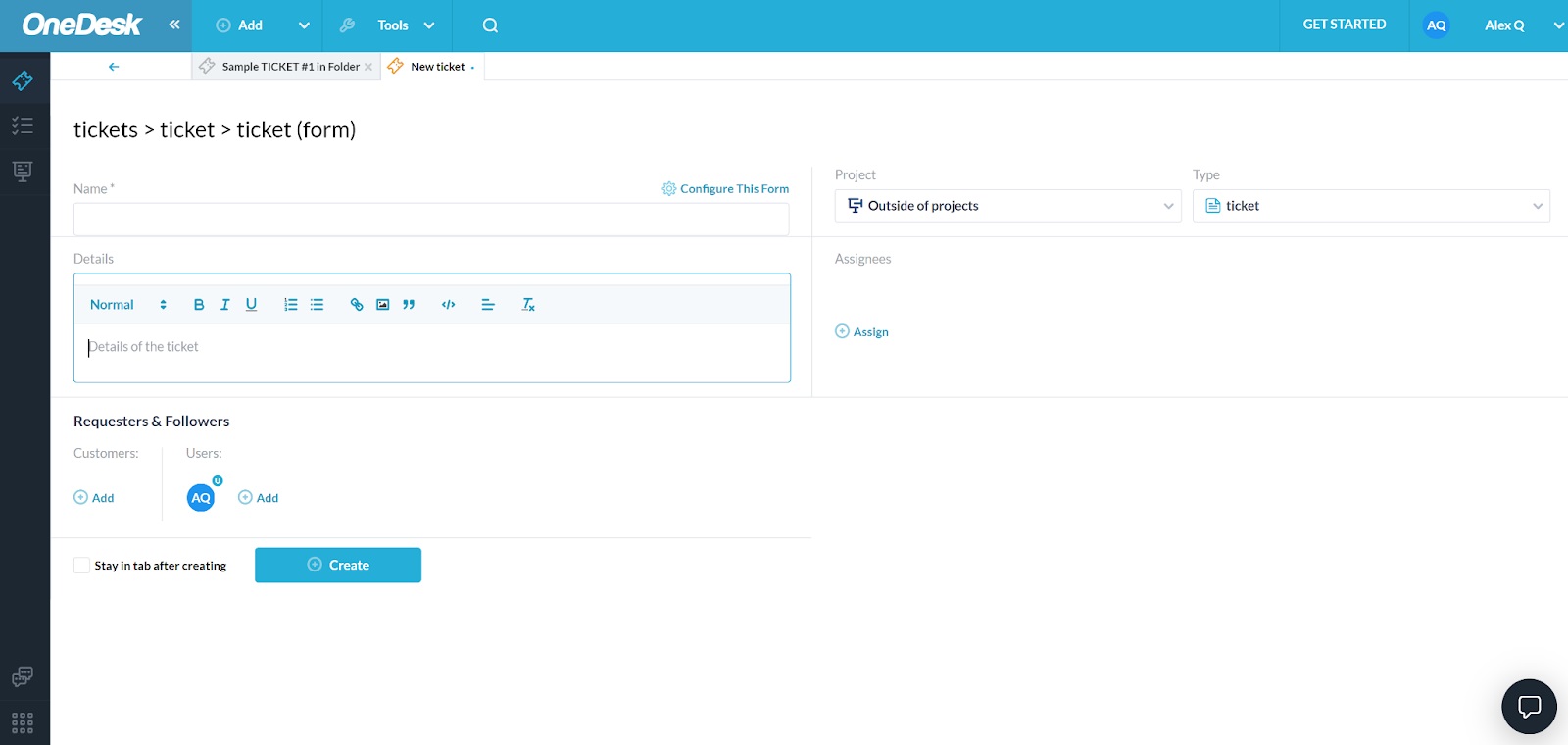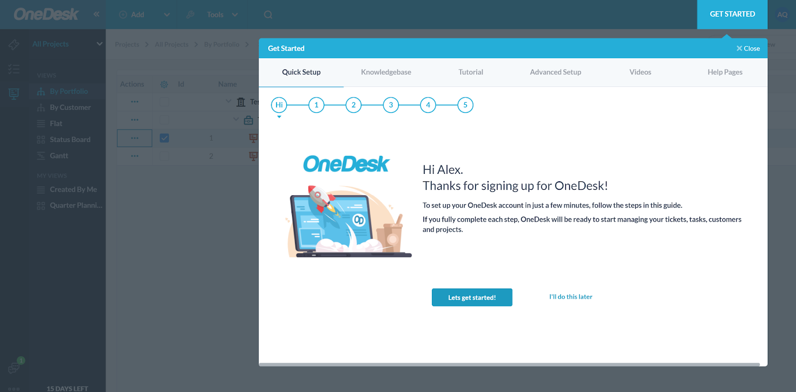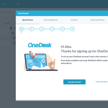 Programska oprema za zahtevke OneDesk ponuja enostaven postopek registracije brez zahtev po kreditni kartici ali drugih ovir. Lahko se preprosto prijavite in začnete brezplačno preskusno obdobje, preden se odločite za plačljivi načrt. OneDesk bo naložil vašo novo nadzorno ploščo in vas pozdravil s preprostim, a učinkovitim začetnim vodnikom, ki vas bo vodil skozi osnovno nastavitev vašega novega delovnega prostora. Lahko ga preskočite in dokončate nastavitev pozneje, če želite.
