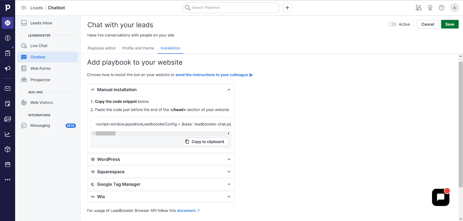 Čeprav lahko odkrito rečem, da so funkcije pretoka PipeDrive zelo dobro zasnovane, je škoda, da vas aplikacija v bistvu prisili v uporabo chatbota. Klepetalni robot PipeDrive si bomo ogledali v ločenem pregledu, zato se osredotočimo na implementacijo klepeta v živo PipeDrive. Ko ste zadovoljni z zasnovo poteka, lahko izberete zavihek Namestitev in izbirate med različnimi možnostmi, vključno z WordPressom, Squarespaceom, Google Tag Managerjem, Wixom ali ročno namestitvijo. Za namen tega pregleda sem izbral ročno namestitev.