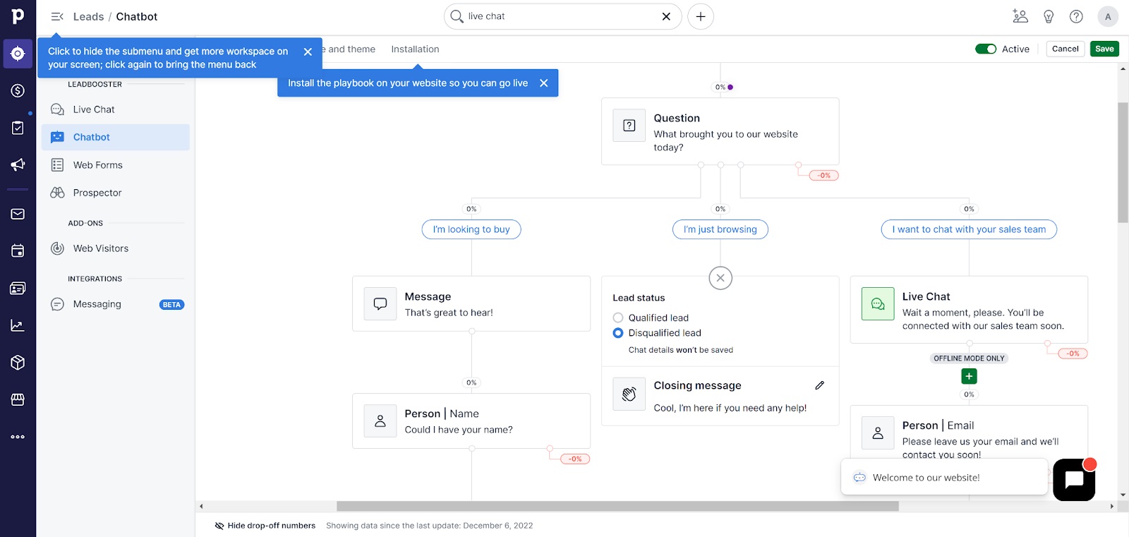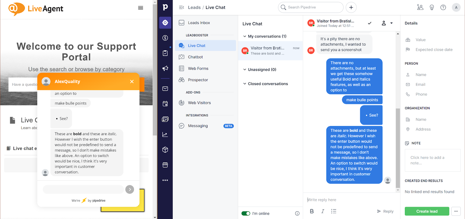 Spletno mesto PipeDrive ne navaja natančnih funkcij klepeta v živo, ki so na voljo, z izjemo chatbota in integracije s preostalim naborom orodij CRM za pridobivanje več potencialnih strank. Naslednji razdelek vam bo pokazal izkušnjo dela s klepetom v živo PipeDrive na obeh straneh in pregledali bomo vse razpoložljive funkcije.