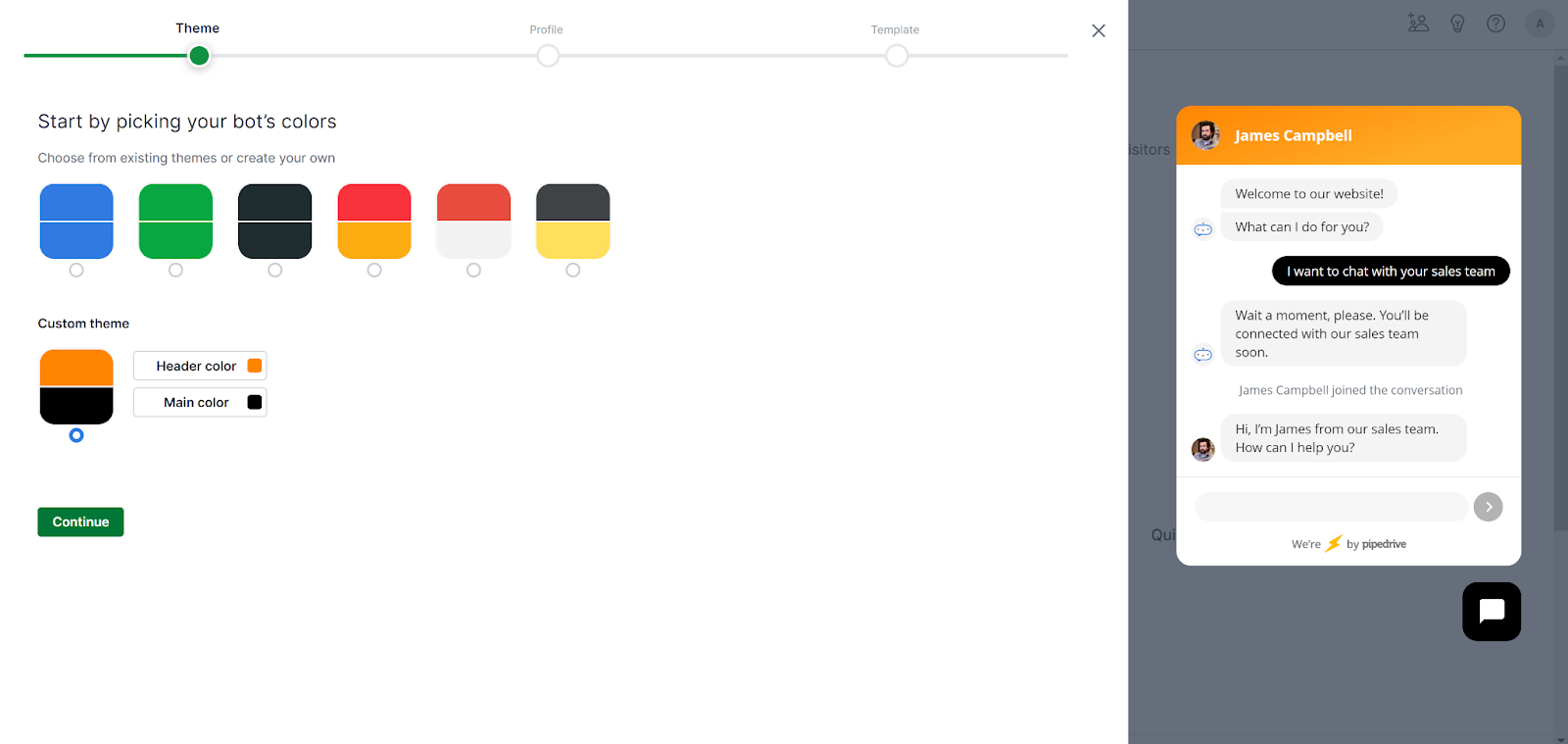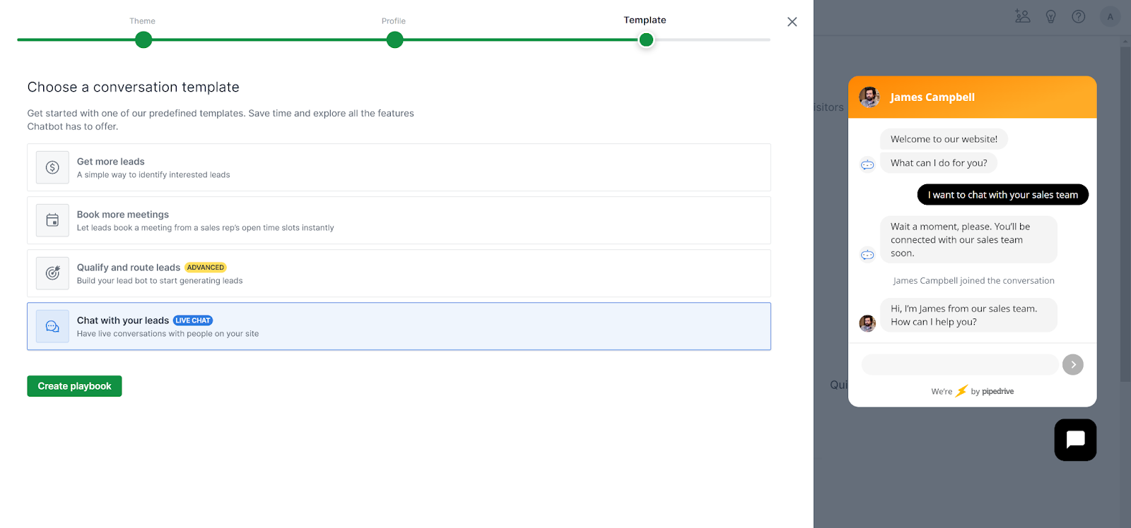 V naslednjem razdelku vas bo PipeDrive obvezno prosil, da definirate svoj chatbot (tudi če ga ne želite). Nato vas razdelek vpraša za namen vašega klepeta v živo in lahko izberete, ali želite ustvariti več potencialnih strank, rezervirati več sestankov ali se kvalificirati in usmeriti potencialne stranke. Končno obstaja možnost pogovorov v živo s strankami, zato se prepričajte, da boste izbrali to možnost, če vas chatbot ne zanima.