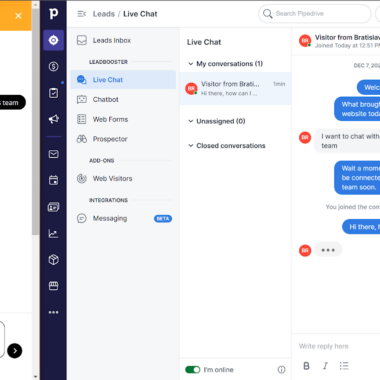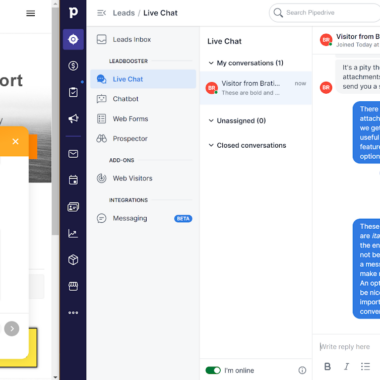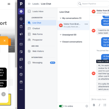 Pipedrive je dobro znana programska oprema za upravljanje odnosov s strankami, ki lahko služi tudi kot programska oprema za klepet v živo. Ponuja zanesljiv in uporaben nabor funkcij, ki lahko pokrije vse vaše potrebe po CRM. V tem pregledu pa si bomo ogledali klepet v živo in njegove funkcije ter ugotovili, kako delujejo in kako enostavni so za uporabo. Začnimo.