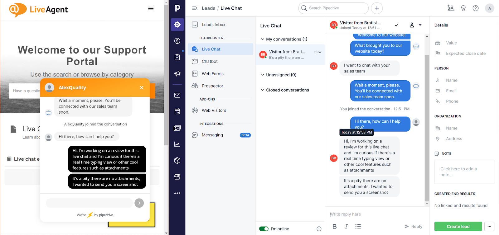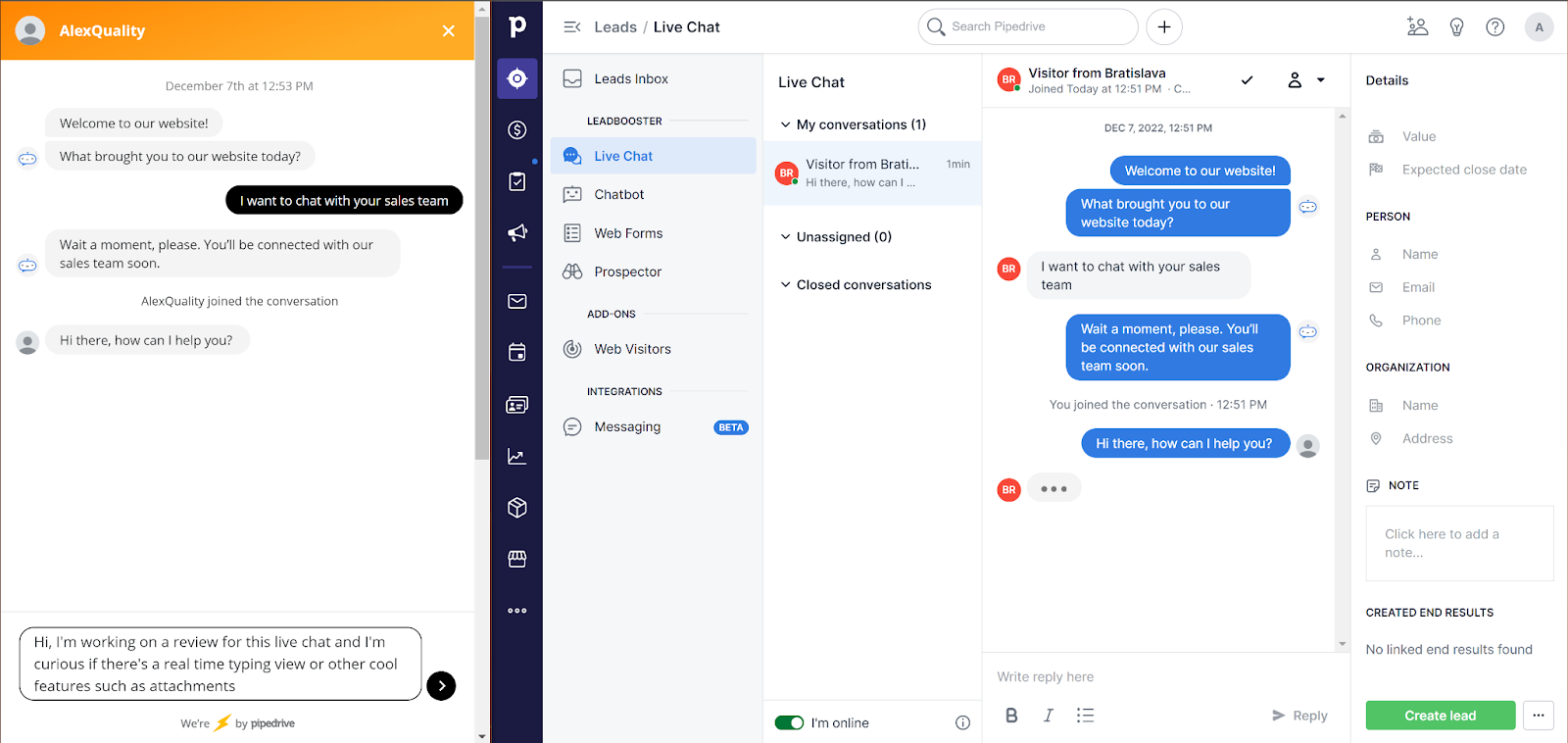 Začel sem pisati, da bi najprej preveril, ali klepet v živo PipeDrive podpira funkcijo pogleda tipkanja v realnem času, vendar je žal ne podpira. Na splošno je klepet v živo preveč osredotočen na izkušnjo chatbota in nekoliko zanemarja dejanski del klepeta v živo. Sploh ni na voljo nobenih funkcij za priloge, zato je ta klepet v živo izključno za pisno komunikacijo. To je zadostna možnost za večino uporabnikov, vendar je vedno lepo imeti dodatne funkcije. Brez priponk bodo uporabniki morda prisiljeni preklapljati med klepetom v živo in e-pošto ali katerim koli drugim komunikacijskim kanalom, ki podpira priponke.