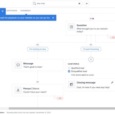 Kar sledi, je konfiguracija toka. Ker je to posebnost PipeDrive, tega postopka res ne morete preskočiti; konfigurirati morate začetni tok skozi sistem, podoben usmerjanju IVR. Predstavljen vam bo vizualni prikaz možnosti in dejanj, ki jih lahko avtomatizirate s svojim klepetom v živo. Na srečo, če se odločite samo shraniti spremembe, ne da bi karkoli konfigurirali, bo vse v redu, saj PipeDrive takoj ponuja vnaprej določen tok klepeta. Vendar pa še vedno poteka nekaj avtomatizacije in je ni mogoče izklopiti. Kot stransko opombo, to zadeva samo bistvene stvari pogovora.